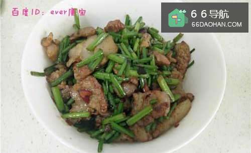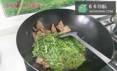 6待猪肉炼出猪油后,将韭菜花倒入锅内和肉一起炒勺,韭菜花容易熟而且会出水,因此这一步一定要保持大火且快速翻炒,直到韭菜花有明显的颜色变深时,可放入少量的酱油提色;