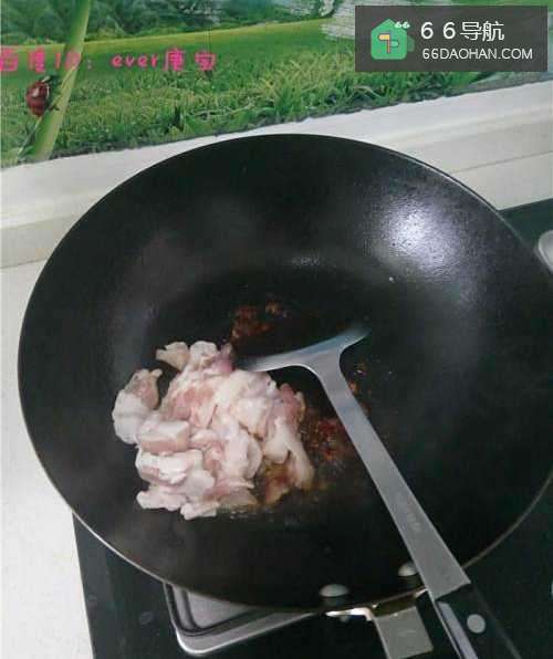 5把郫县豆瓣略炒出香味之后立刻将猪肉放入,火开大继续翻炒,直到将全部猪肉都裹上了豆瓣酱;