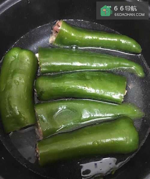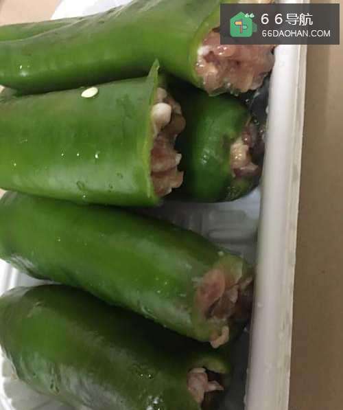 5把搅拌好的肉放进辣椒里面。