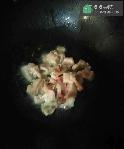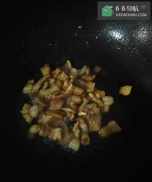 开火,加入适量油,将腊肉下锅,翻炒至腊肉出油;