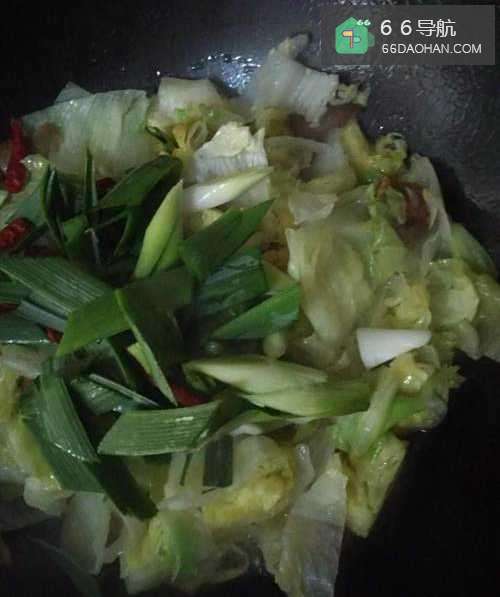 待锅里生菜78成熟时,将蒜苗段加入锅里一起翻炒;
