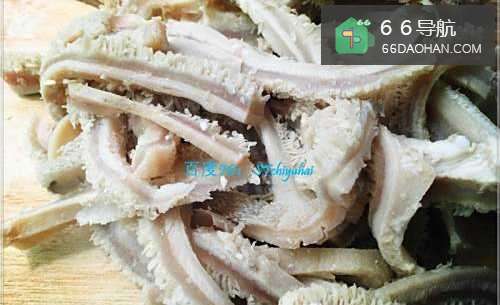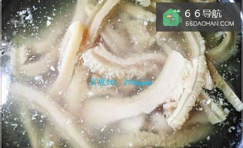这里选用半处理好的牛肚,不用再次处理牛肚上那层脏物质,将牛肚切成丝条状,然后取一个碗,将其放入碗中,加入适量的盐,揉搓一阵。
