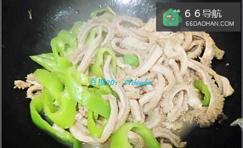 6先加入青尖椒大火翻炒一会,待尖椒变色之后再倒入腌制的牛肚,混合炒。