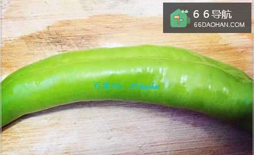 4准备一个新鲜的青尖椒,将其去头去尾清洗干净,然后斜切成小段状。
