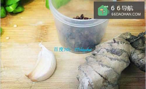5准备一些辅料生姜、蒜头、滕椒,分别处理一下;同时将刚才的锅清洗干净,沥干水渍,加入适量的油,放入辅料爆香一会。