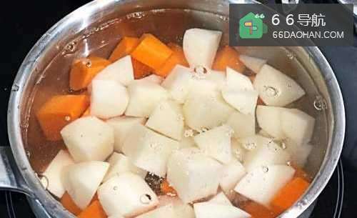 2准备一小锅水,放入红萝卜与马铃薯煮15分钟左右。