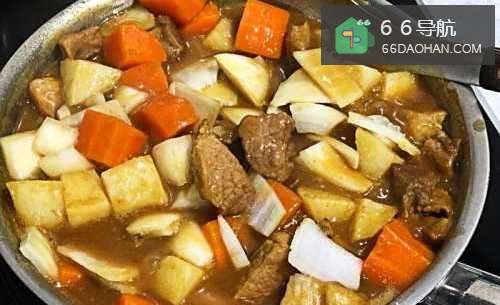 5加入水煮滚,转中小火或熄火,加入咖喱块煮拌到全部融化。