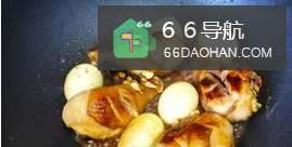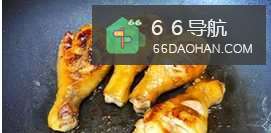 6白糖下锅熬糖色,下鸡腿煎至两面金黄