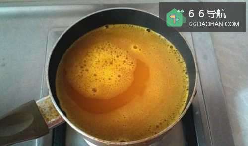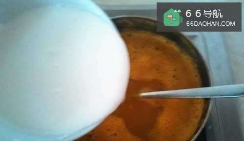 5将南瓜糊倒入到不粘锅中,开小火及加入细砂糖再次煮开