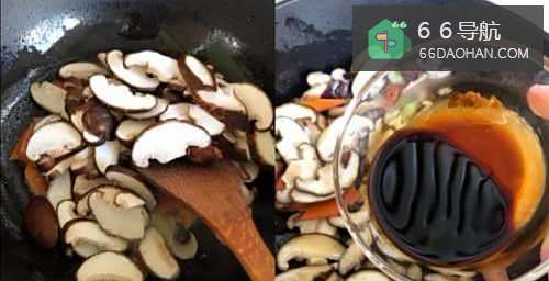 4锅中烧油,放葱爆香,放入胡萝卜翻炒一会儿,再放入香菇翻炒一会儿,倒入酱汁再加水翻炒一分钟。