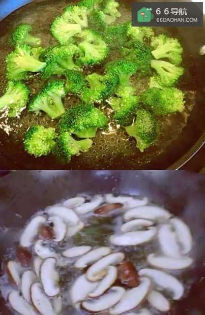 3锅中烧水,水中放一点点盐、一点点油,将西蓝花焯水一分钟捞出沥干水分,香菇过水捞出沥干水分备用,这样焯过水的西蓝花会更加翠绿,也会去除香菇的土味。