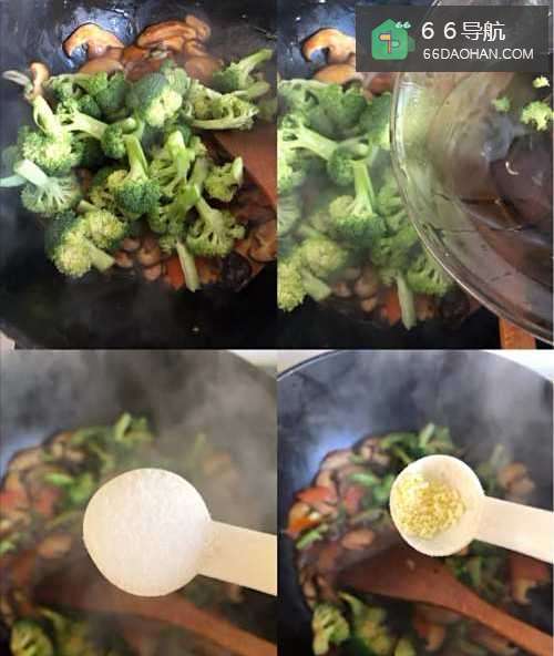 5放入西蓝花,加入适量盐和鸡精,加水翻炒三到五分钟出锅即可。