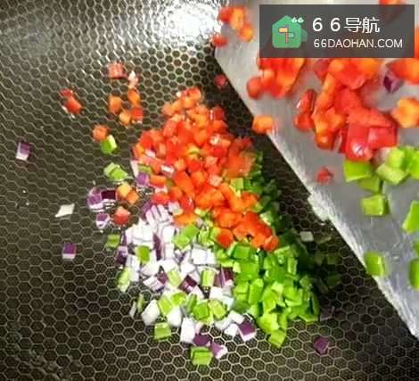 3锅留底油,放入盐,洋葱丁,青红椒丁,耗油;