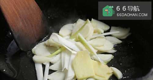 5锅中留底油,下姜片、蒜片、大葱煸出香味。