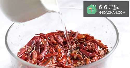 干红辣椒和花椒中加入清水浸泡五分钟,沥水待用。