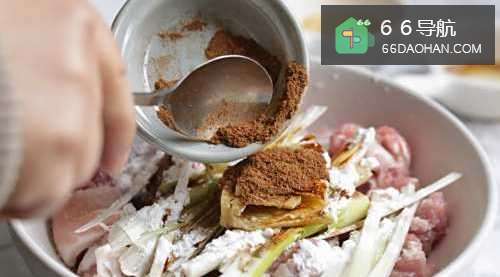 2排骨中加入料酒、盐、大葱、姜片、生粉、生抽、老抽、五香粉抓匀,再加些许油抓匀腌制半小时以上。