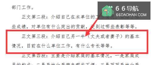 5正文第三段介绍自己另一半(丈夫或者妻子)的基本情况,目前在什么单位工作,有什么专长等等。
