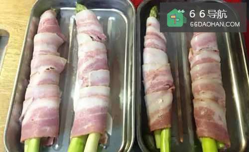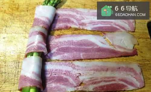2把三片培根排好,放上芦笋,斜斜地往旁边卷