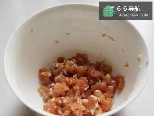 3 猪肉切碎,伴如姜蒜、淀粉、盐、味精调匀。