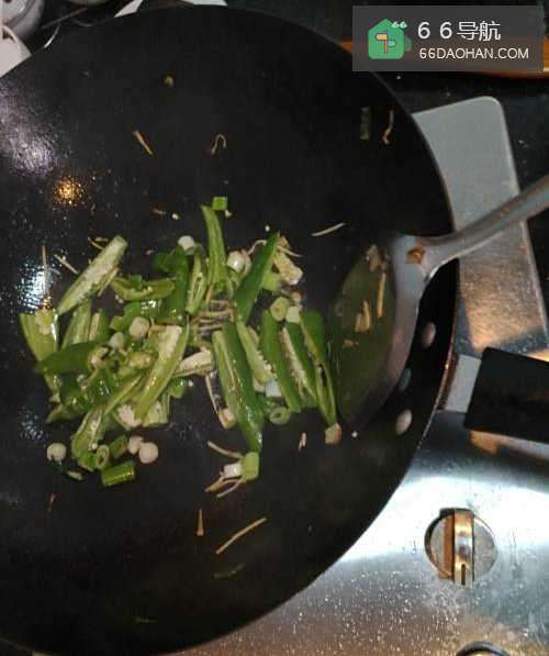 4第四步,倒入青椒翻炒一会,炒出青椒香味。
