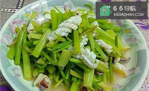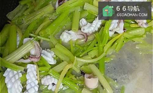 4下芹菜,略微翻炒后,加一杯水稍微焖煮三分钟。