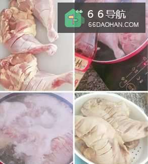 大鸡腿洗干净,不爱吃吃鸡皮所以去掉了,用刀划口正反面,凉水下锅倒入料酒煮出血沫,捞出备用。