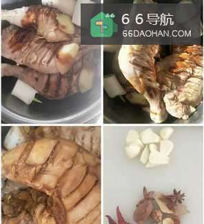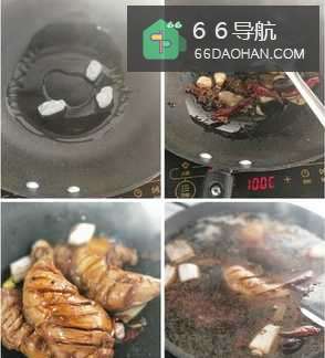 3倒油小火放入冰糖,放入花椒,辣椒,桂皮,八角,大料,蒜片开始炒,放入腌制的鸡腿来回翻炒,倒入腌制后的汁,倒入开水,炖大概1小时左右,收汁。