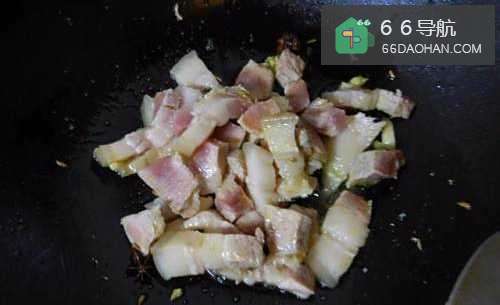 55.入五花肉,翻炒,放入生抽,白糖,让五花肉上色入味;