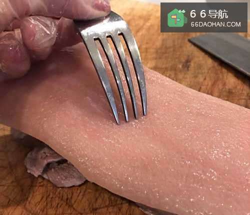 2把水分擦干后用叉子在猪皮上扎出小洞