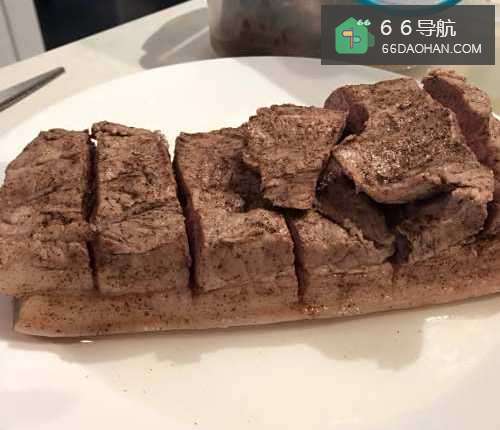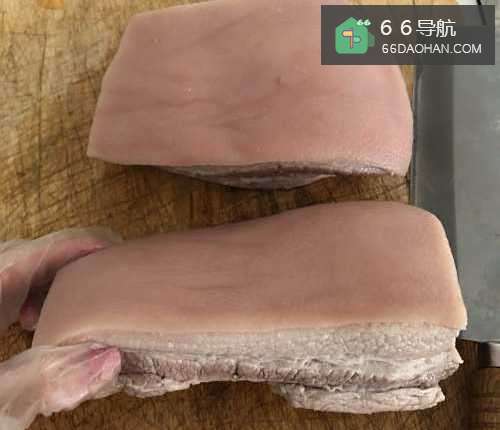 4把肉的一面切上几刀(不要切到猪皮),把腌料均匀涂抹上去,再将猪皮的一面放进白醋浸泡几分钟
