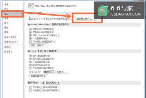 5在【Word选项】弹出框中切换至【校对】页面,点击【自动更正选项】