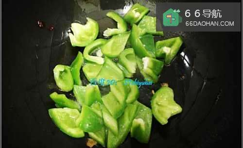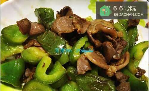 5先加入青椒薄片翻炒一会,有五六分熟后加入鸭胗片,混合翻炒一会。