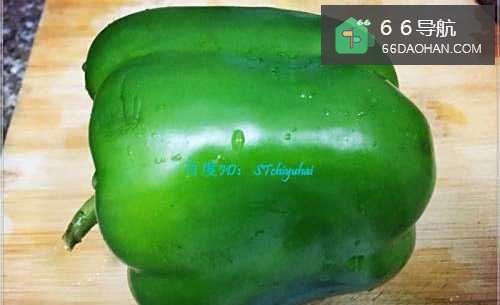 准备一个新鲜的青椒,将其清洗干净,对半切开,然后剜去蒂头部分,掏去籽料,然后切成薄片状。