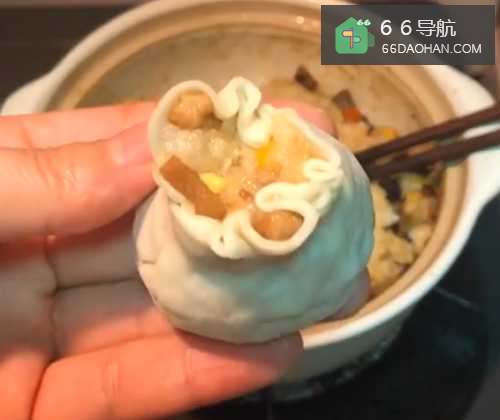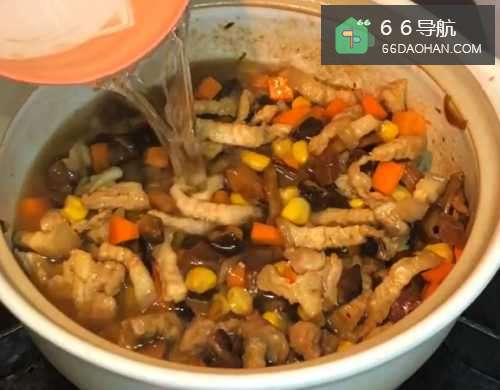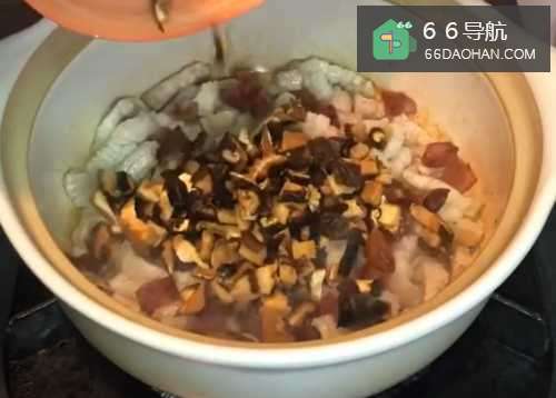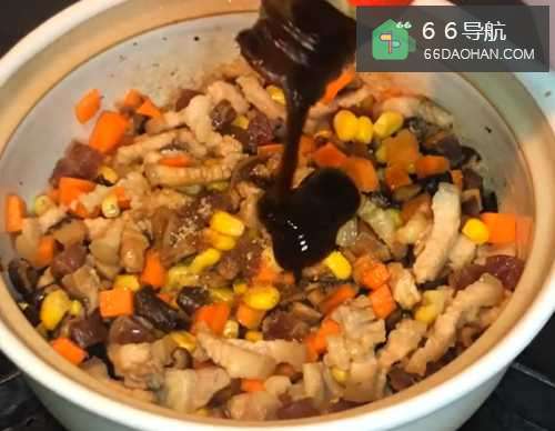 4加入清水,与食物齐平,加盖子蒸煮,大火收汁,加入熟的糯米,搅拌均匀