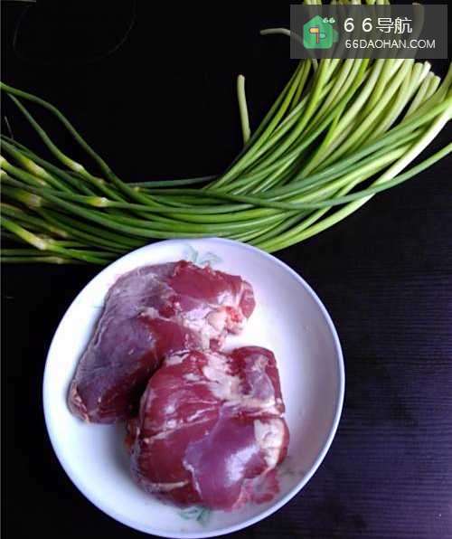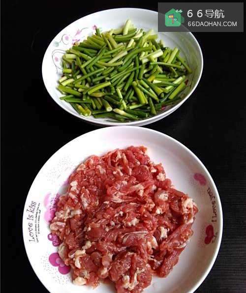 2猪肉洗净切成肉丝,蒜薹洗净切断。