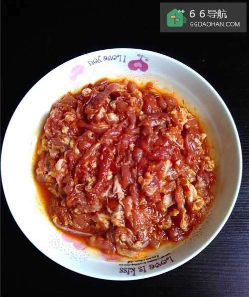 3肉丝拌入郫县豆瓣酱,淀粉搅拌均匀,腌制片刻。