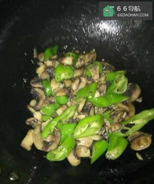 5再开火,将白蘑菇下入锅里炒熟,炒到白蘑菇变软即可;青椒在下锅炒;