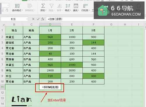 7选择单元格【D12】,输入公式【=SUM(浅绿)】,按【Enter】键即可;