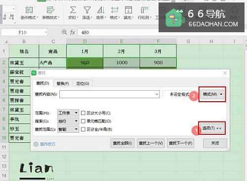 3在“查找”对话框,点击【选项】—【格式】—【从单元格选择格式】—【背景颜色】,点击单元格【颜色】;