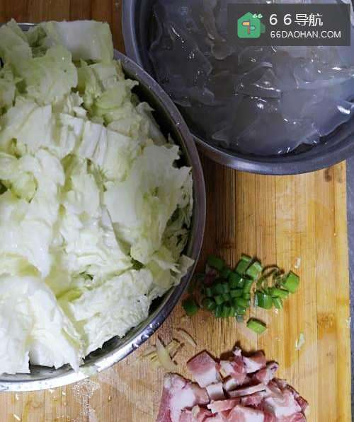 首先是食材准备工作一张粉皮掰小块温水泡发,白菜清洗切小块,五花肉切小块,适量葱和姜切好备用。