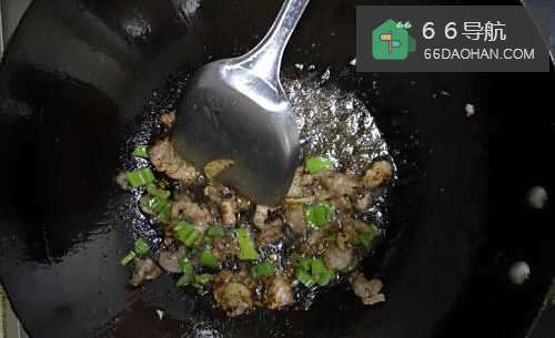3沥出花椒和八角,将五花肉放入锅中煸炒至微微出油,随后放入葱花和姜翻炒,然后加入豆瓣酱调味。