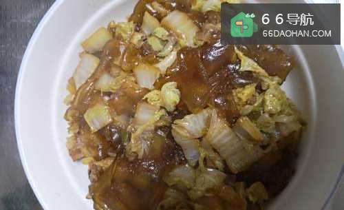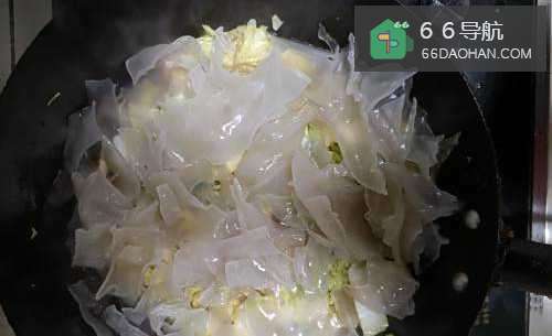 4倒入白菜进行翻炒,将白菜炒至缩水时依次放入耗油、酱油进行调味,翻炒后放入泡好的粉皮。