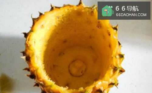 4将菠萝中间的果肉部分用刀和勺子挖去