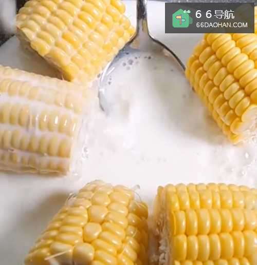 2放入锅中,倒入牛奶,将玉米翻滚一下
