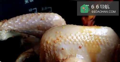 4准备平时煮饭的电饭煲,先在锅底铺上香葱段,再把腌制好的土鸡放入其中,浇淋上腌制的调味汁,盖上盖按照正常的煮饭模式煮制即可食用。