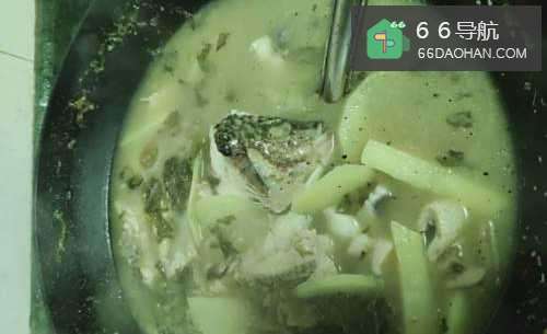 1、酸菜煮开后,先加入鱼骨和鱼头,煮约三分钟。