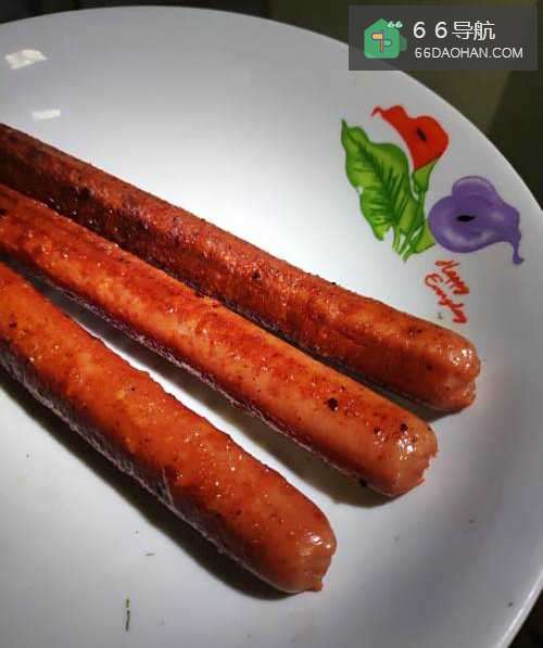 5.锅装盘,在香肠表面撒上胡椒粉或者番茄酱。