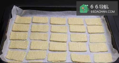9烤盘垫上硅油纸,把切好的饼胚放入烤盘,饼干间留有空隙。