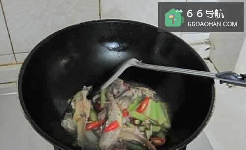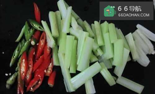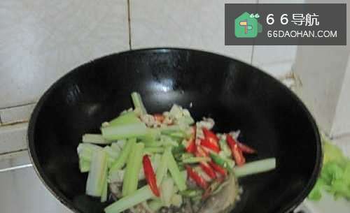 8西芹辣椒下锅一起炒,再放姜,蒜,盐