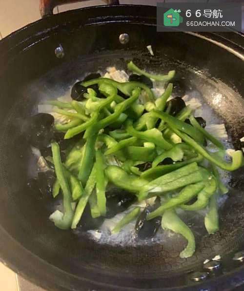 3将青椒木耳放进去,加入适量的白糖、胡椒粉、生抽翻炒